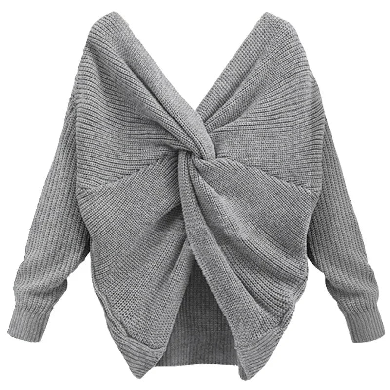 But what truly makes this sweater a standout piece is its unique twisted design in the back, guaranteed to make you the center of attention wherever you go. Whether you wear it with the criss cross detail in the front for a flirty look or opt for the criss cross in the back for an edgy vibe, you're sure to turn heads and stand out in the crowd.